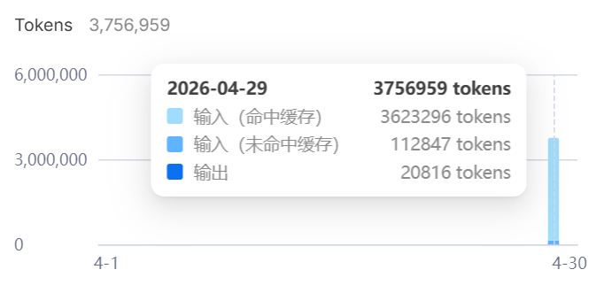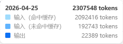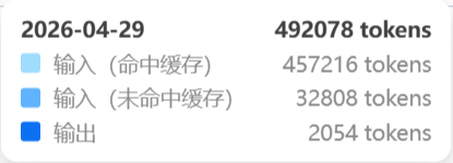 由于编程的上下文大都是英文,所以最终Claude Code计算的tokens总用量和DeepSeek实际的用量差的没那么多了。最终花费不到6毛钱,其中将近97%的缓存命中率立了大功。